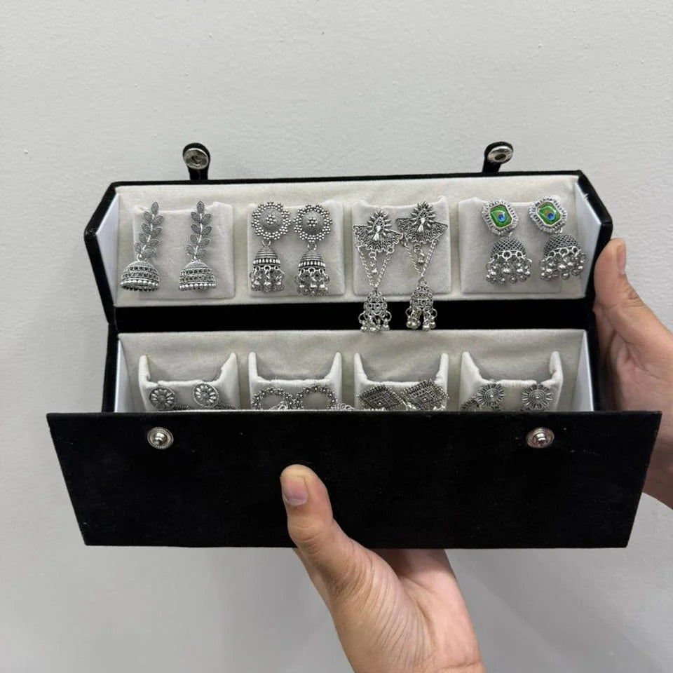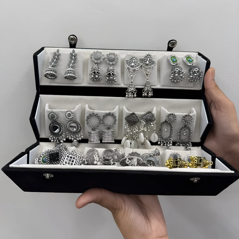 Viral Jewelry Box with 12 Mumkas, a stunning collection designed for every woman who loves to style effortlessly. Each pair is crafted with elegant oxidised detailing, giving you a perfect blend of tradition and modern charm. From everyday looks to festive occasions, these mumkas instantly elevate your outfit with their unique shine.